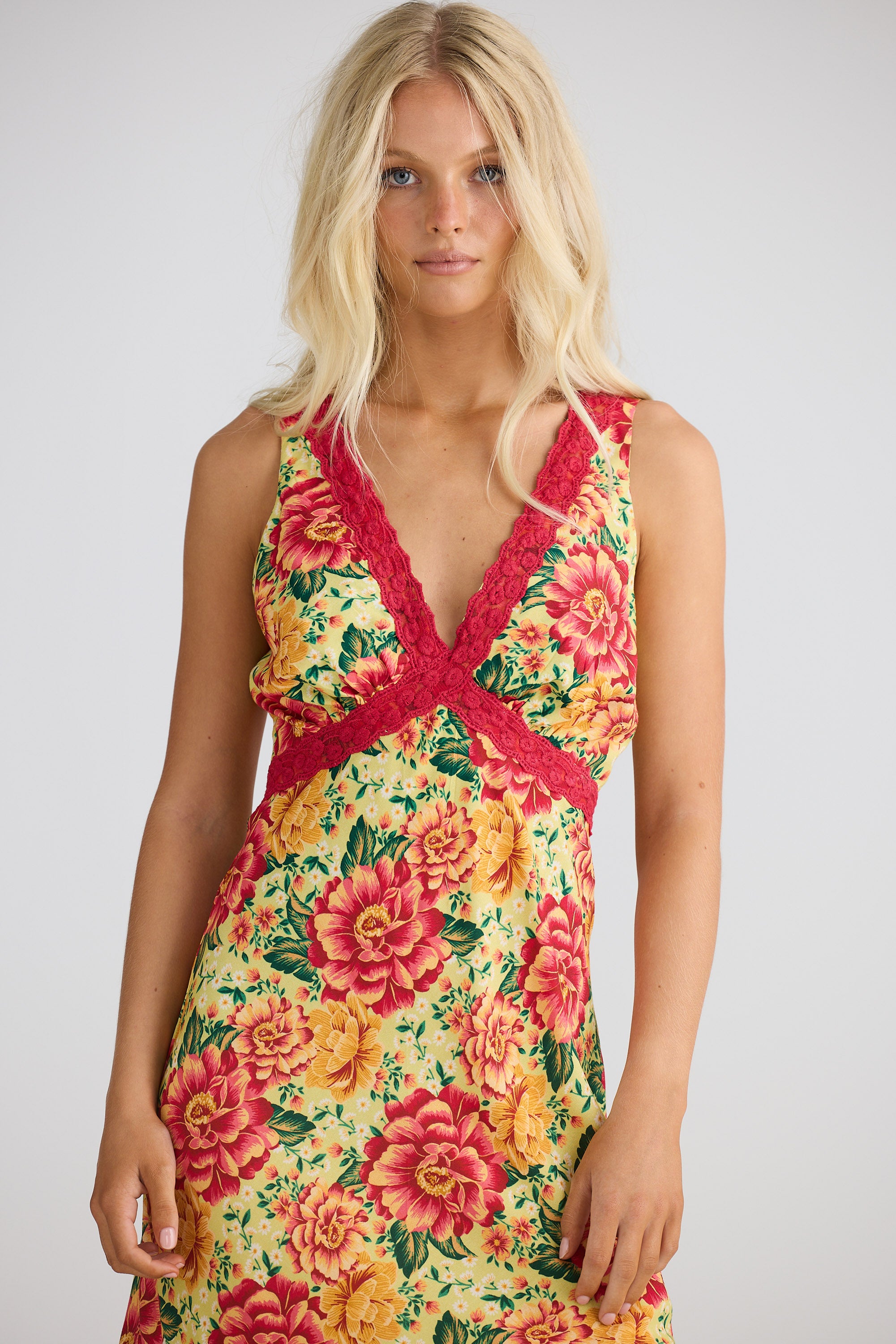 • Lace trim along front neck, underbust and hem