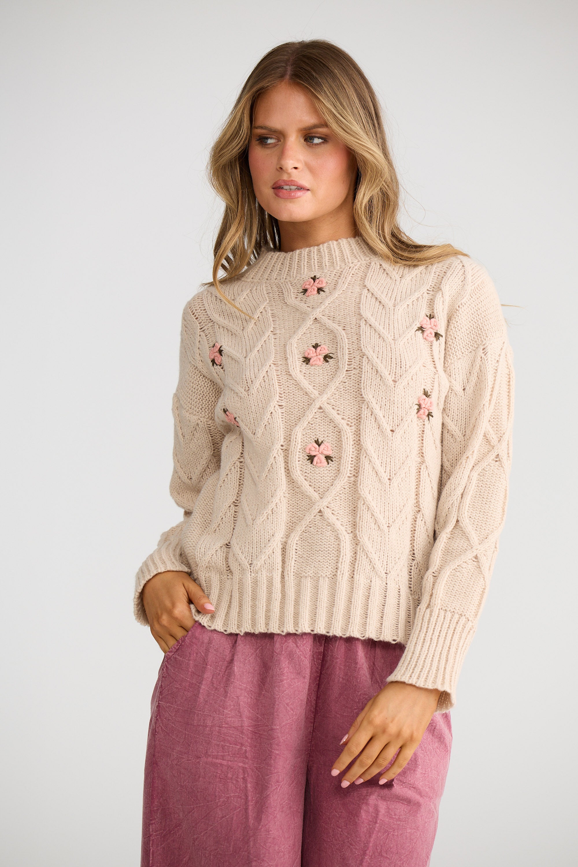 - Cable knit design with embroidered floral details